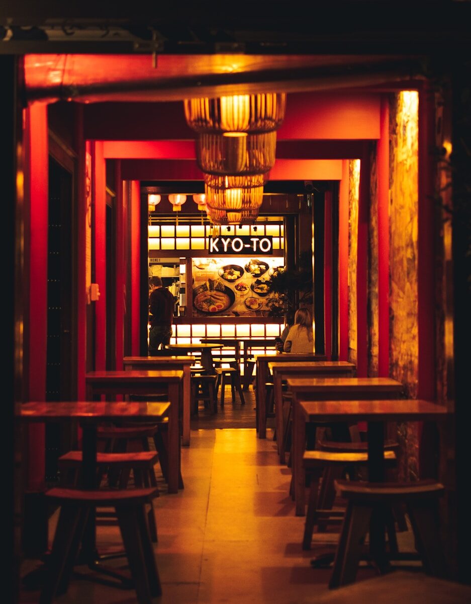 a group of people standing in a room with red lights